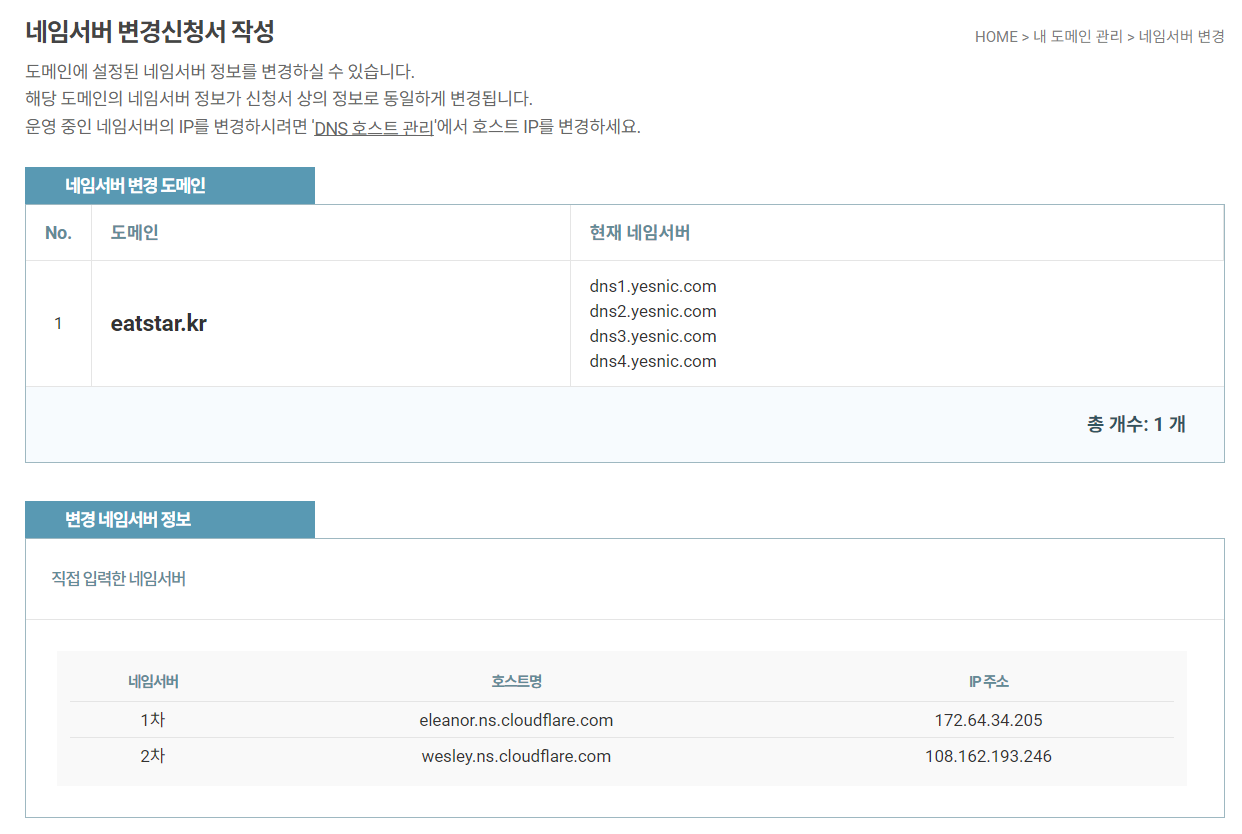 도메인 구매처에서 네임서버 변경신청서를 작성하자. 필자는 예스닉이지만, 다른 도메인 구매처에서도 비슷할 것이다. 다만, 변경되고 Cloudflare 측에서 인지하기까지는 수시간이 걸린다고 한다. 나는 10분만에 완료되긴 했다.