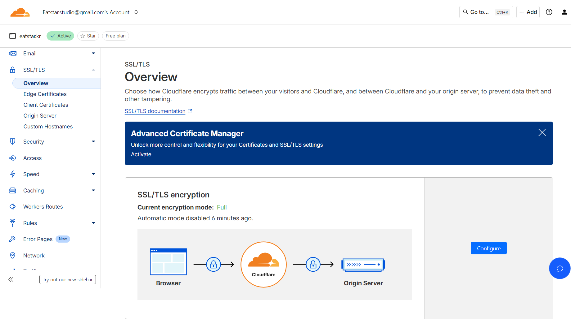 SSL/TLS overview에 들어가서 Configure 버튼을 누르자. 그리고 Full (Strict)로 설정하면 된다.