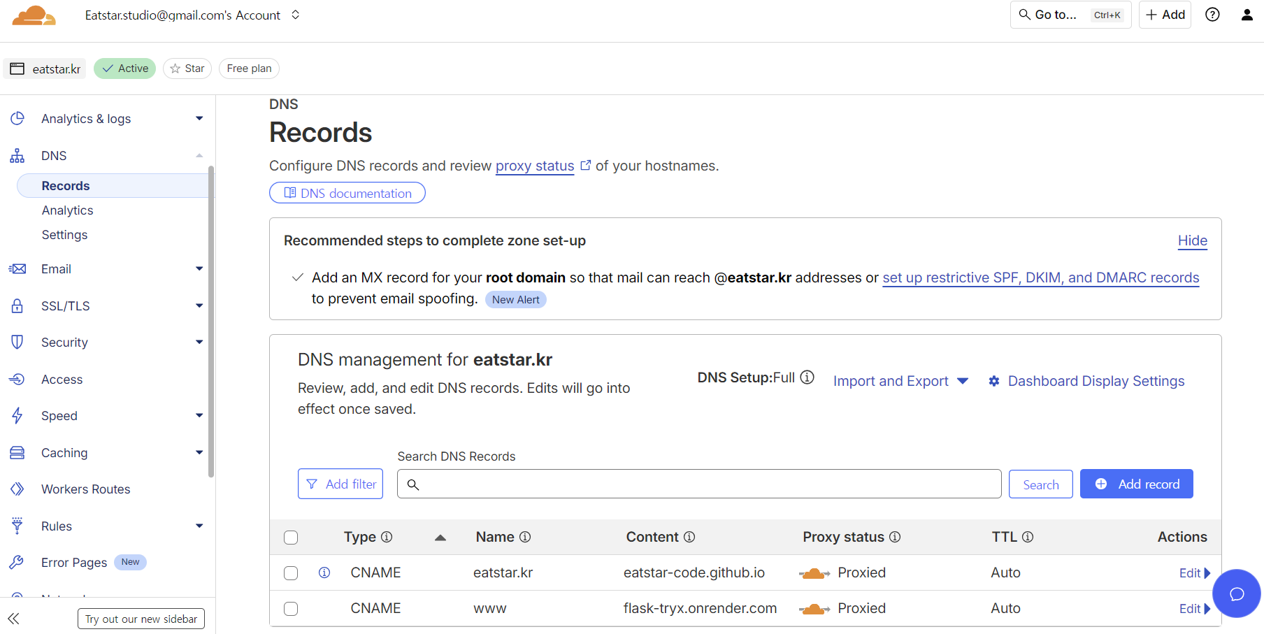 이제 네임서버 운영주체가 도메인 구매처에서 Cloudflare로 변경되었기에 앞으로 여기서 설정해주어야 한다.